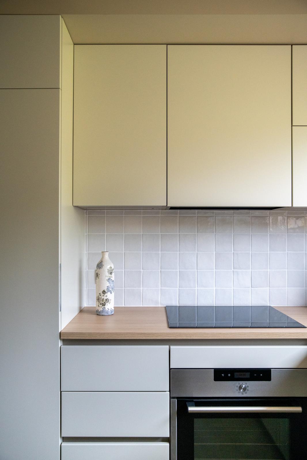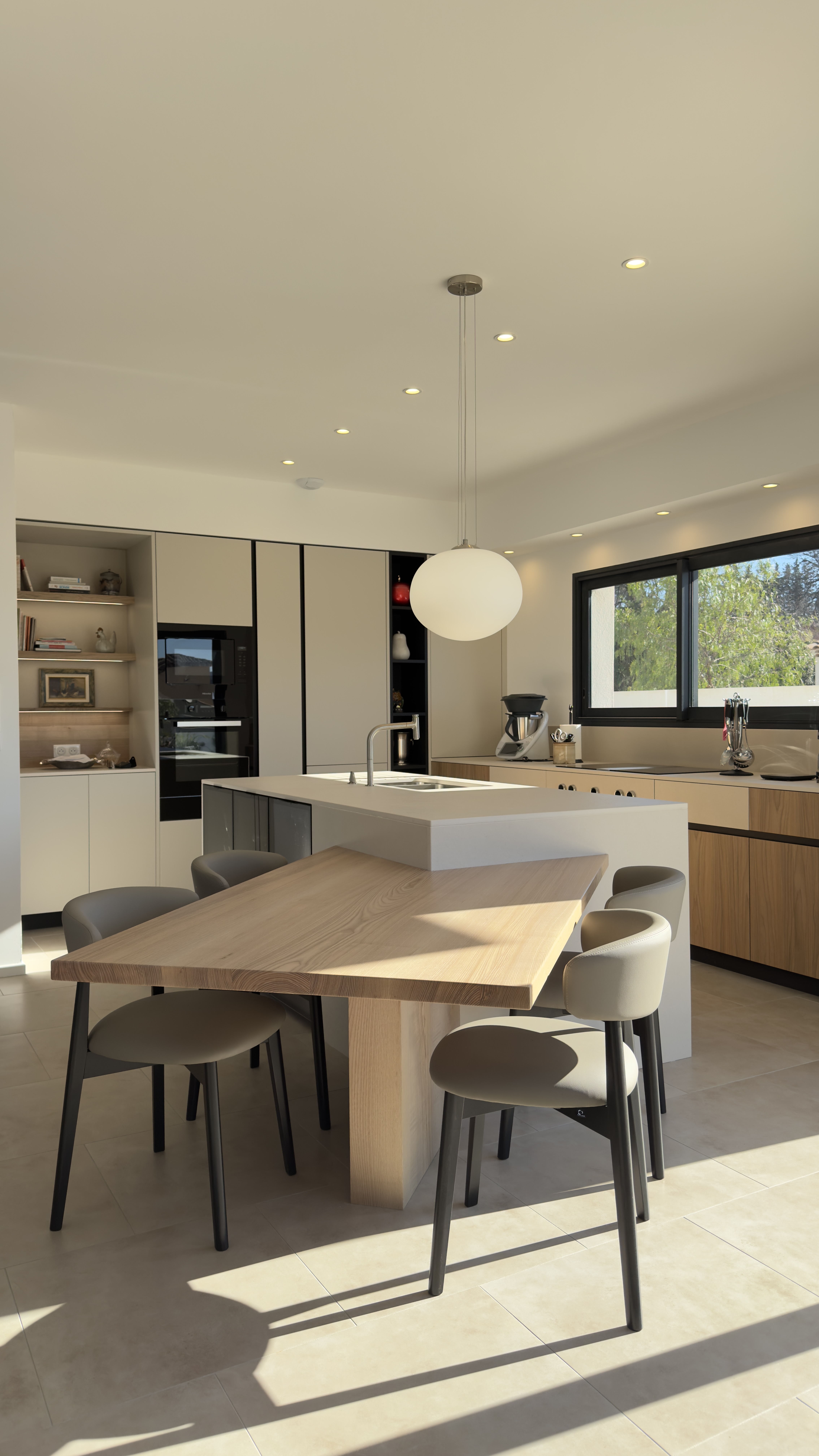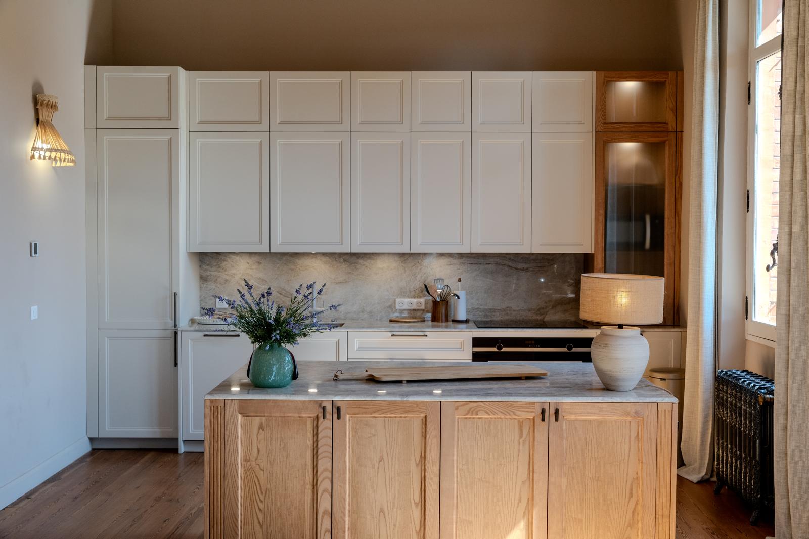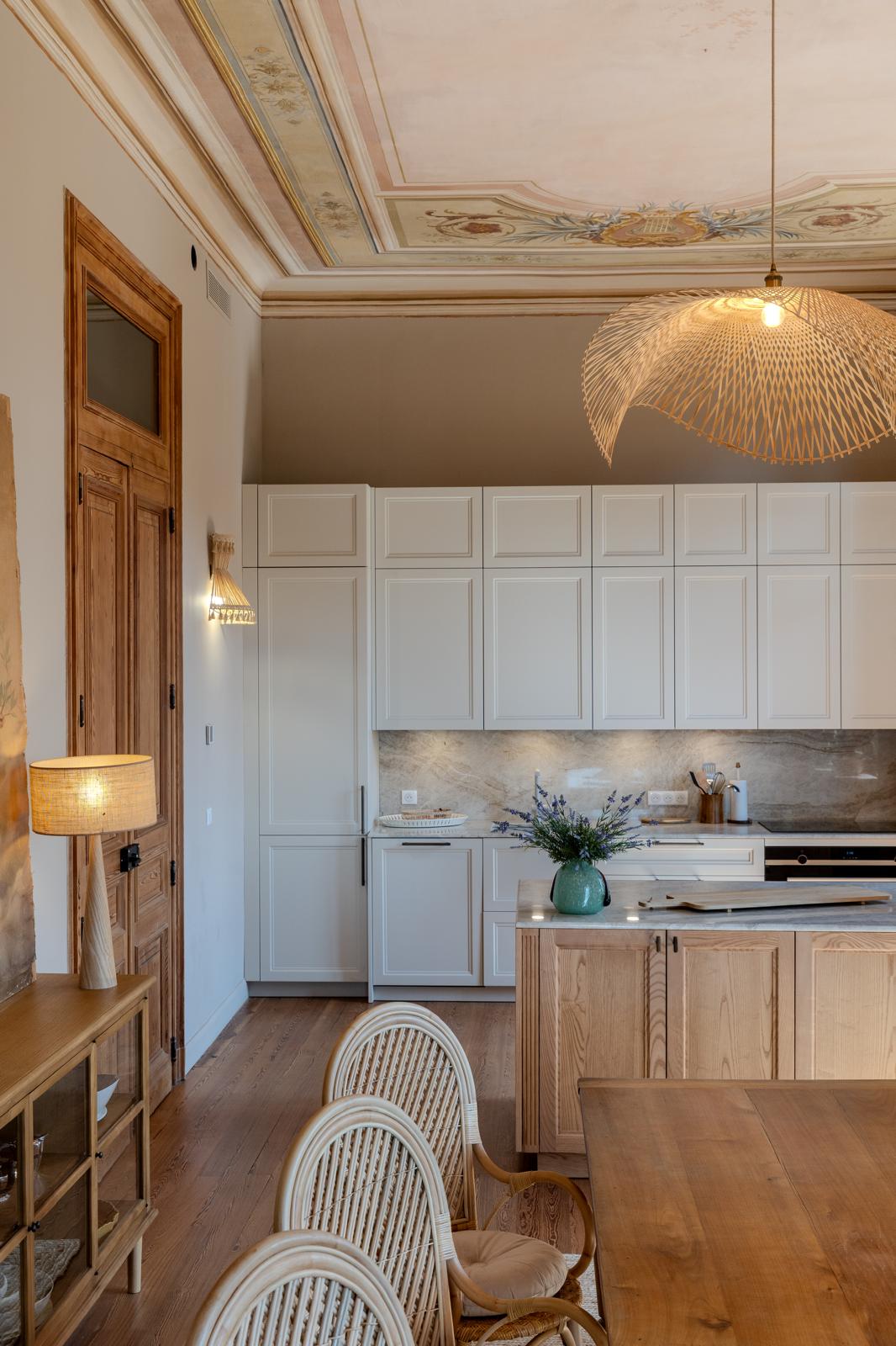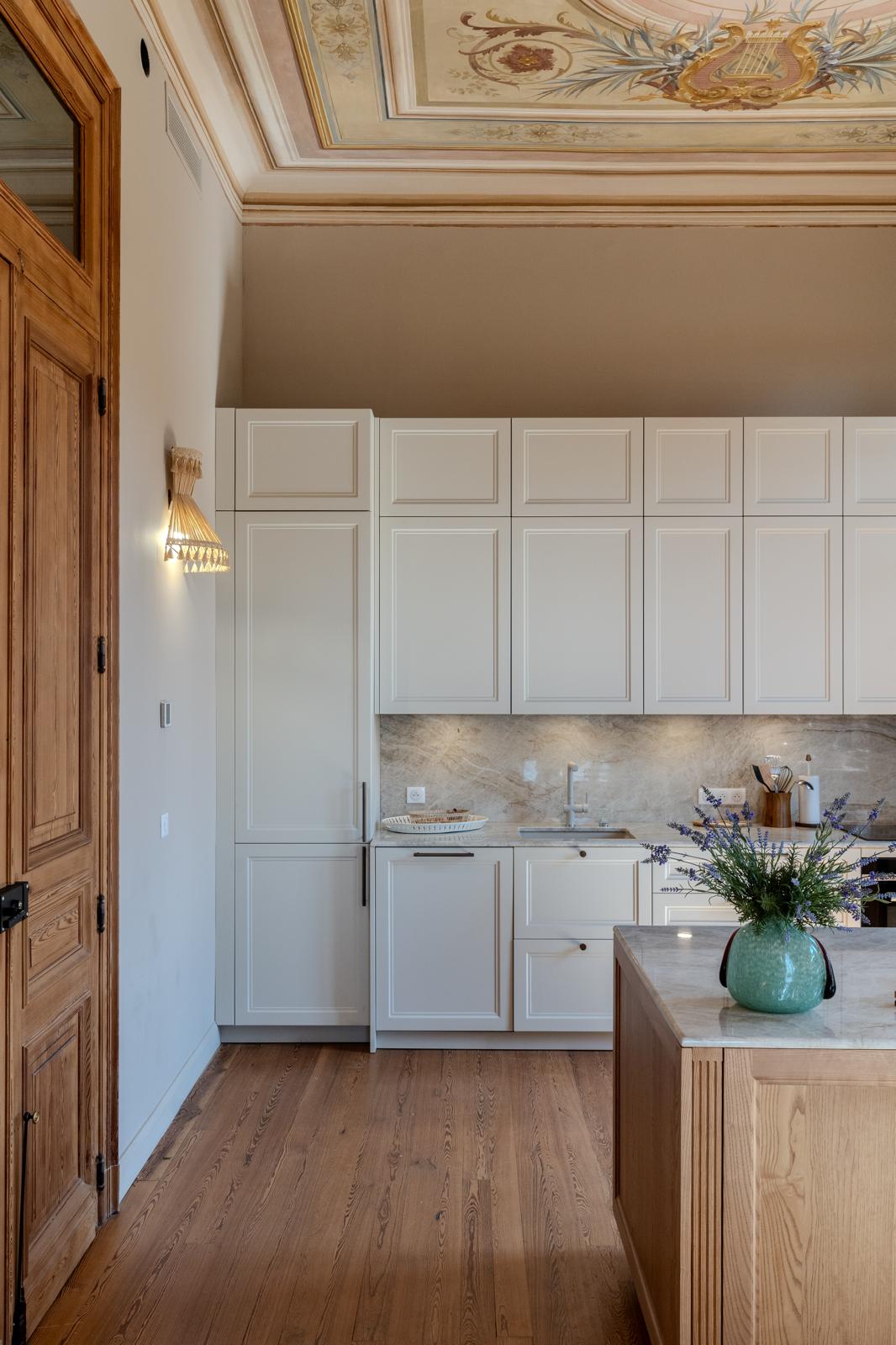 Les lignes épurées des façades à cadre beige répondent à l’îlot en chêne et aux reflets délicats de la quartzite Taj Mahal. En premier plan, la table à manger prolonge la convivialité de l’ensemble, tandis que les fresques restaurées au plafond rappellent la grâce et l’histoire de ce lieu. La lumière envahit cette pièce de vie parsemée de couleurs douces et de poésie.